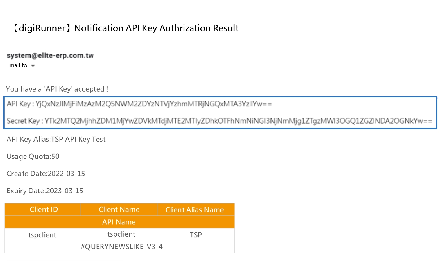 Upon approval of the application, the applicant will receive a notification email titled "【digiRunner】Notification API Key Authorization Result ", containing the API Key and Secret Key. The API Key will be active immediately upon the specified effective date.