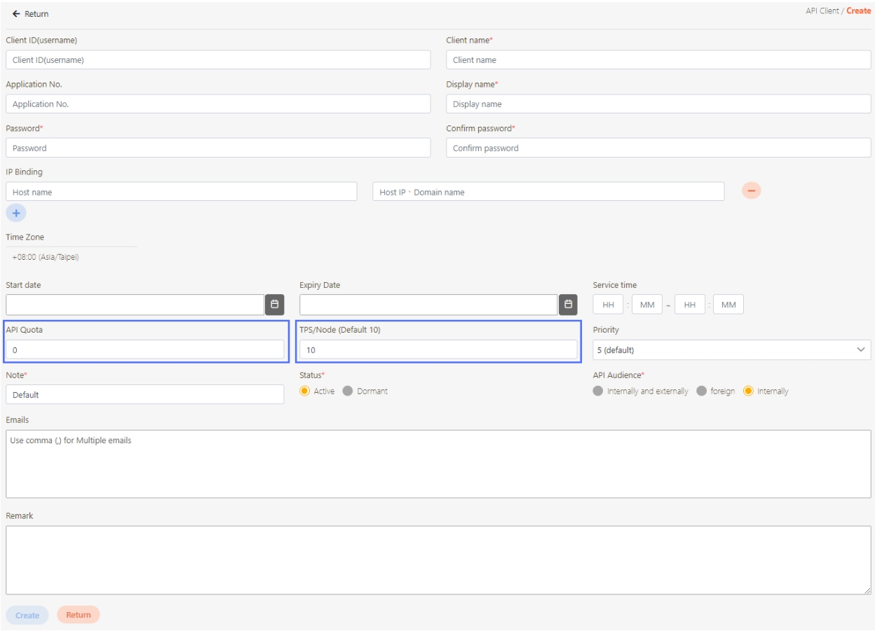 When creating or updating an API client, configure the API Quota and TPS/Node (Transactions per second) settings.