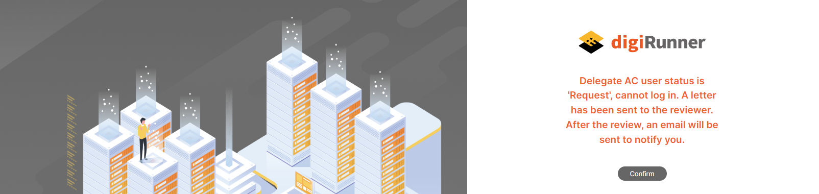 The system displays "Delegate AC user status is 'Request', cannot log in. A letter has been sent to the reviewer. After the review, an email will be sent to notify you.", indicating that the account created by this SSO must be reviewed before it can be used.