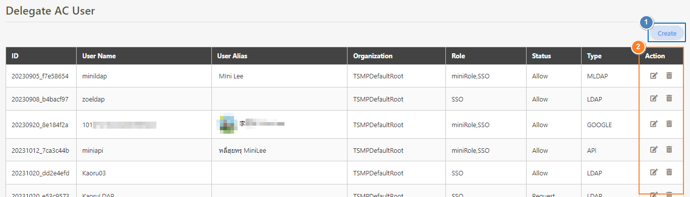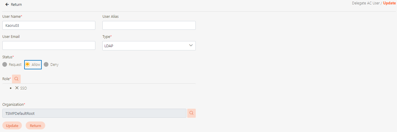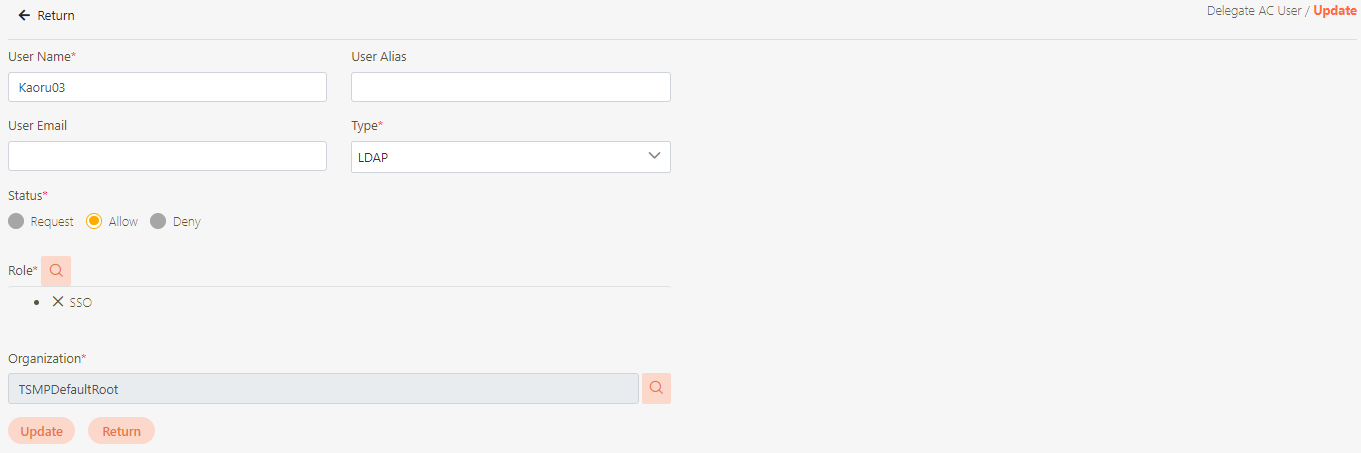 Go to AC User Management > Delegate AC User to view the users created by SSO, and click on the