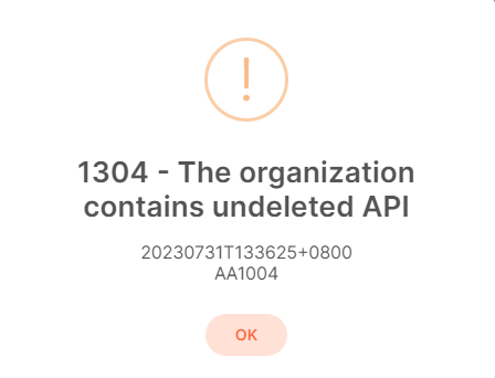 The organization contains undeleted APIs. If a user within the organization has an API created, the user must be deleted or moved to another organization before the current organization can be deleted. Failure to do so will prevent the organization from being deleted, and a warning prompt will pop up.