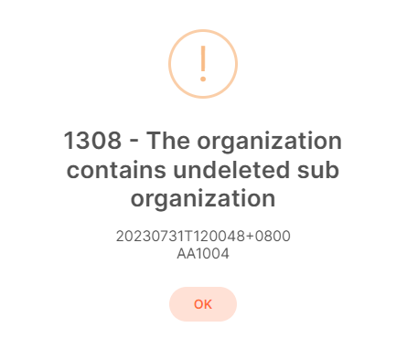The organization contains undeleted sub-organizations. The sub-organizations must be deleted first before the current organization can be deleted. Failure to do so will prevent the organization from being deleted, and a warning prompt will pop up.
