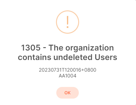The organization contains undeleted users. The users must be deleted or moved to another organization before the current organiztion can be deleted. Failure to do so will prevent the organization from being deleted, and a warning prompt will pop up.