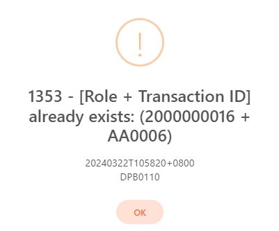 If the Transaction ID was already set in the blacklist first, if this Transaction ID is added to the whitelist, the prompt “1353 - [Role + Transaction ID] already exists: (2000000016 + AA0006)” will appear, meaning that this Transaction ID was already created in the blacklist.