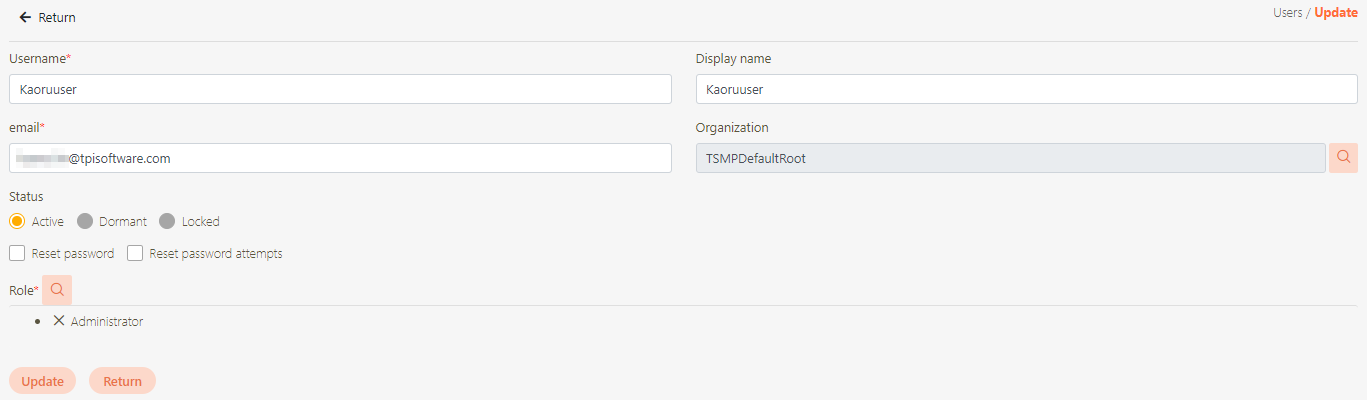 icon next to Organization to display a tree diagram of organizations, and select the organization that the user belongs to.Change the status to Active.