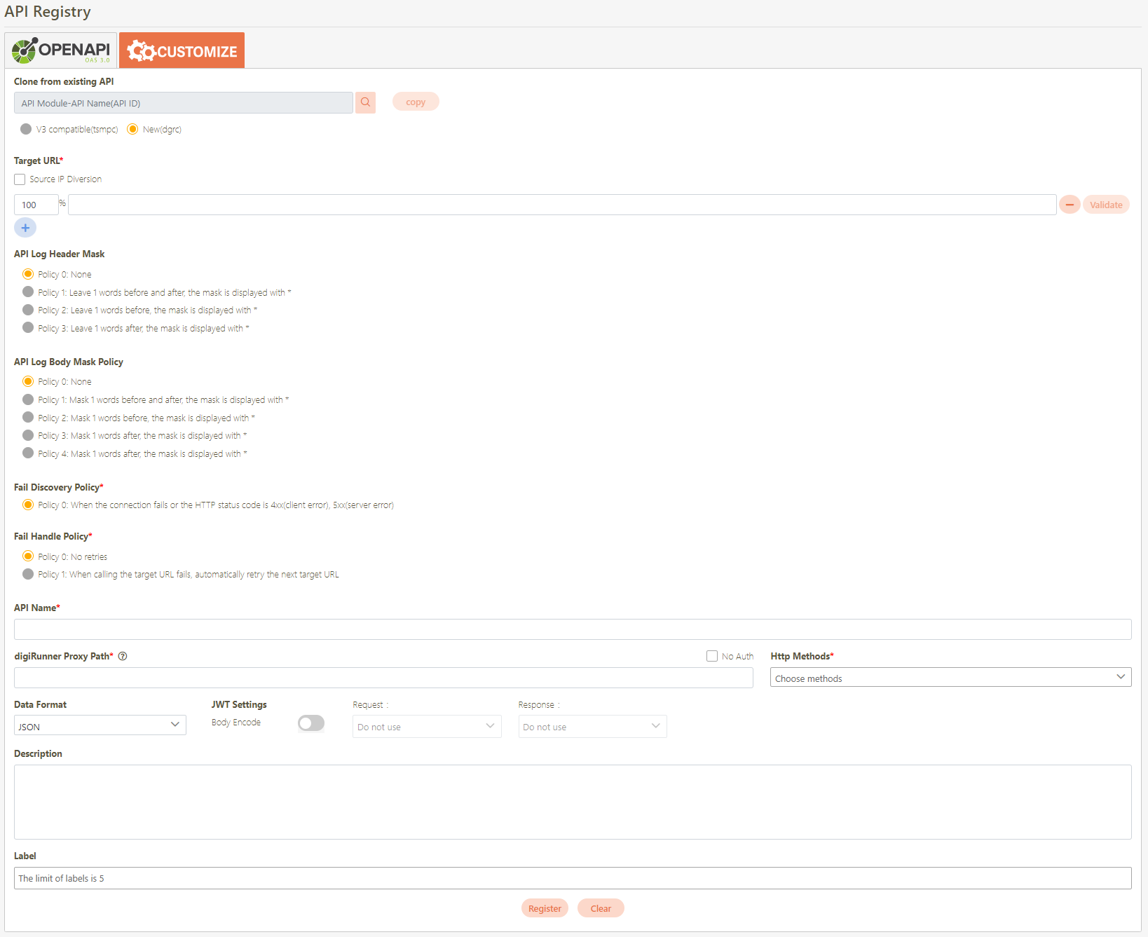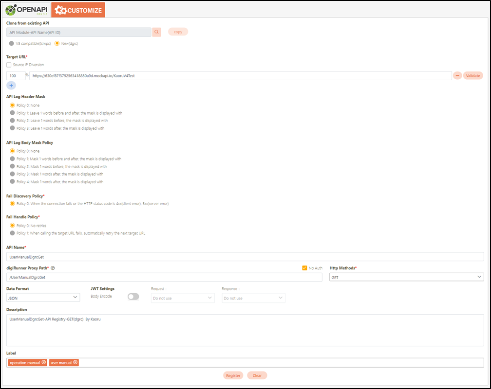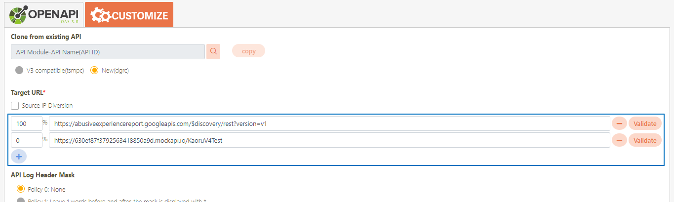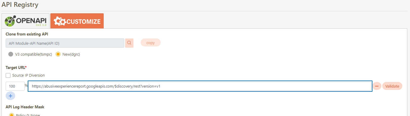Target URL*: Only for registered API, if the source URL has been changed, the new URL can be specified here.