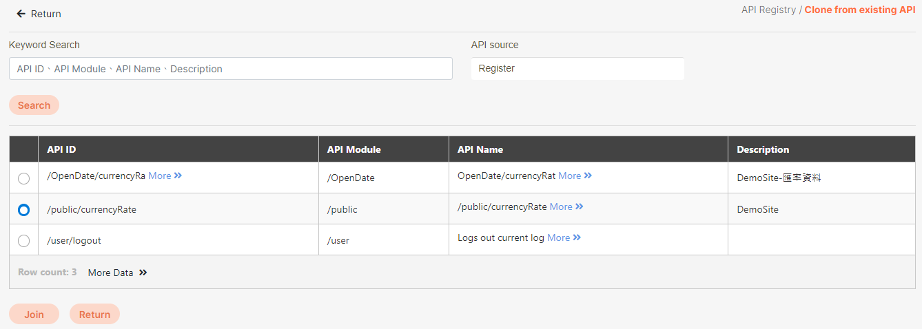 9. Go to Clone from existing API, search for and check the desired API, and click Join.