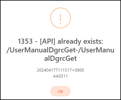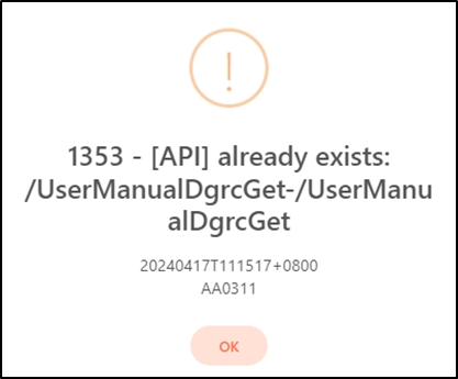 If the API basic information remains unchanged, a warning prompt will pop up, displaying the error message “1353 - [API] already exists”.