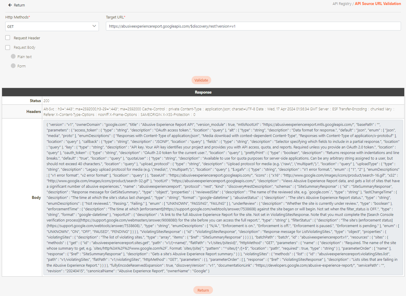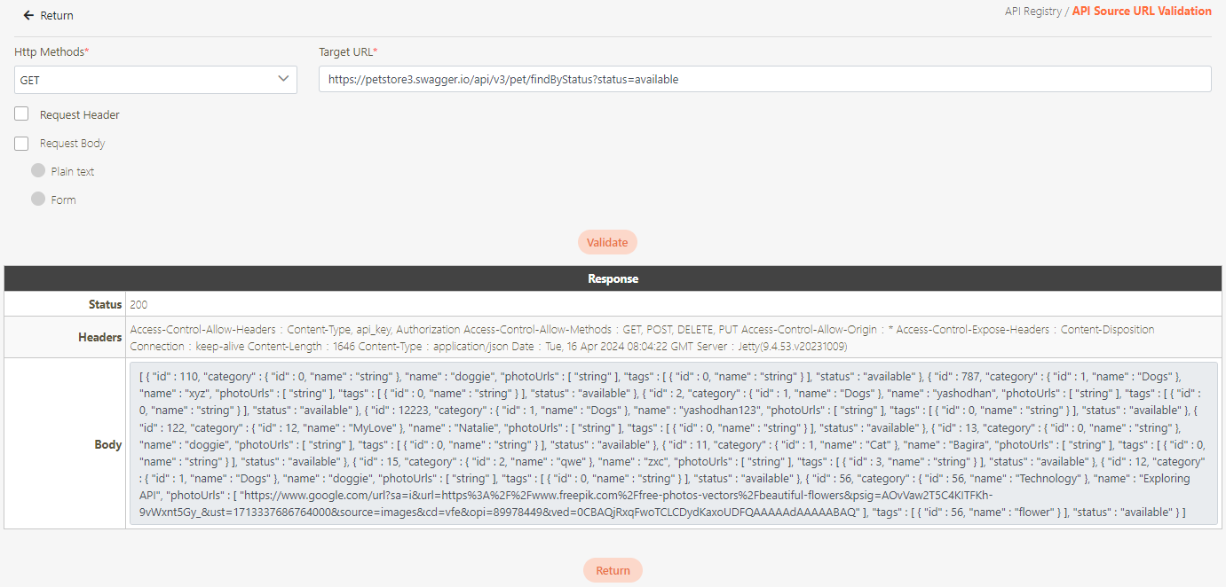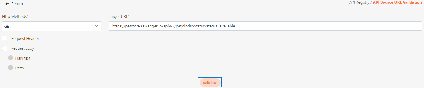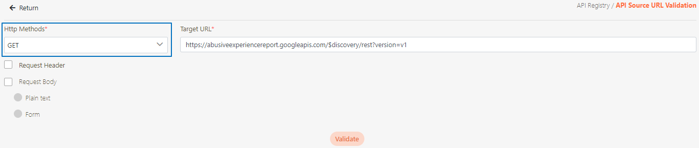 To check if the Http Method and source URL fields are correct, Click Validate.