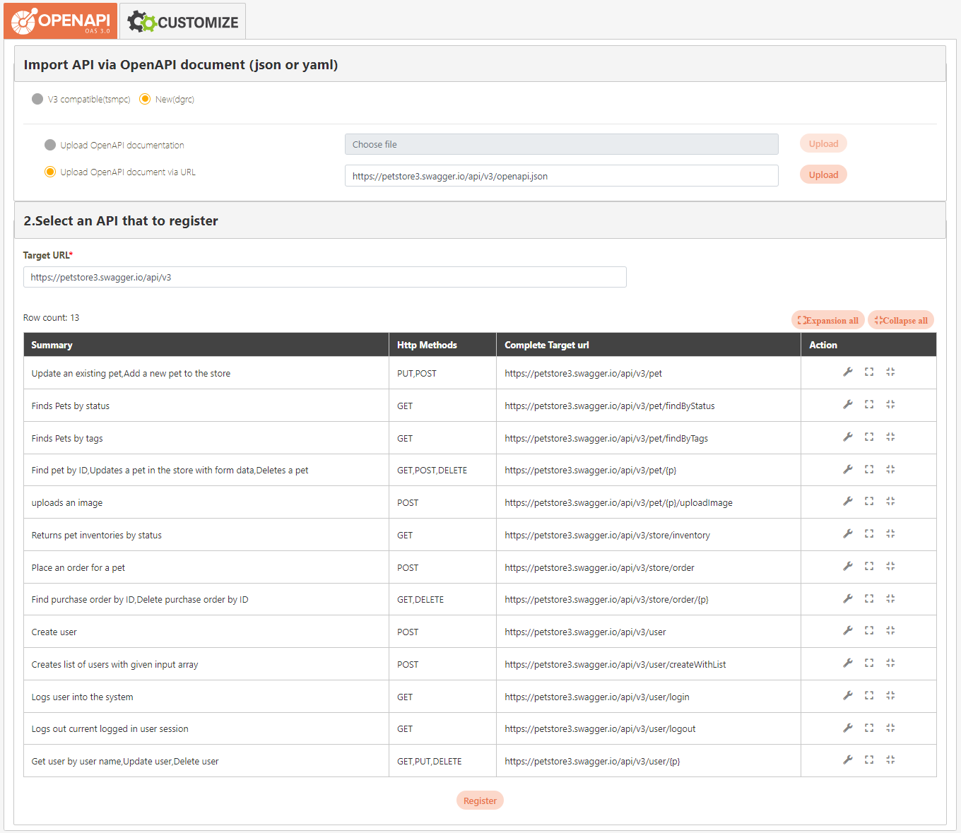 After clicking Register, all APIs in this API module will be registered to the system.
