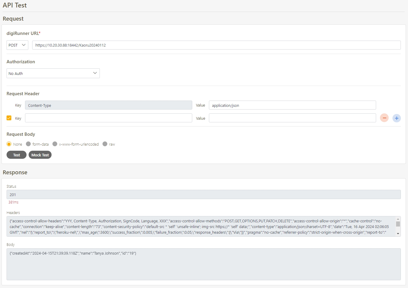 Check the test result in the Response field. If the Status is 201 and data is displayed in both the Headers and Body, the API is functioning correctly and is ready for use. If the response status is 201 and data is displayed in both the Request Header and Request Body, the API is functioning correctly and is ready for use.