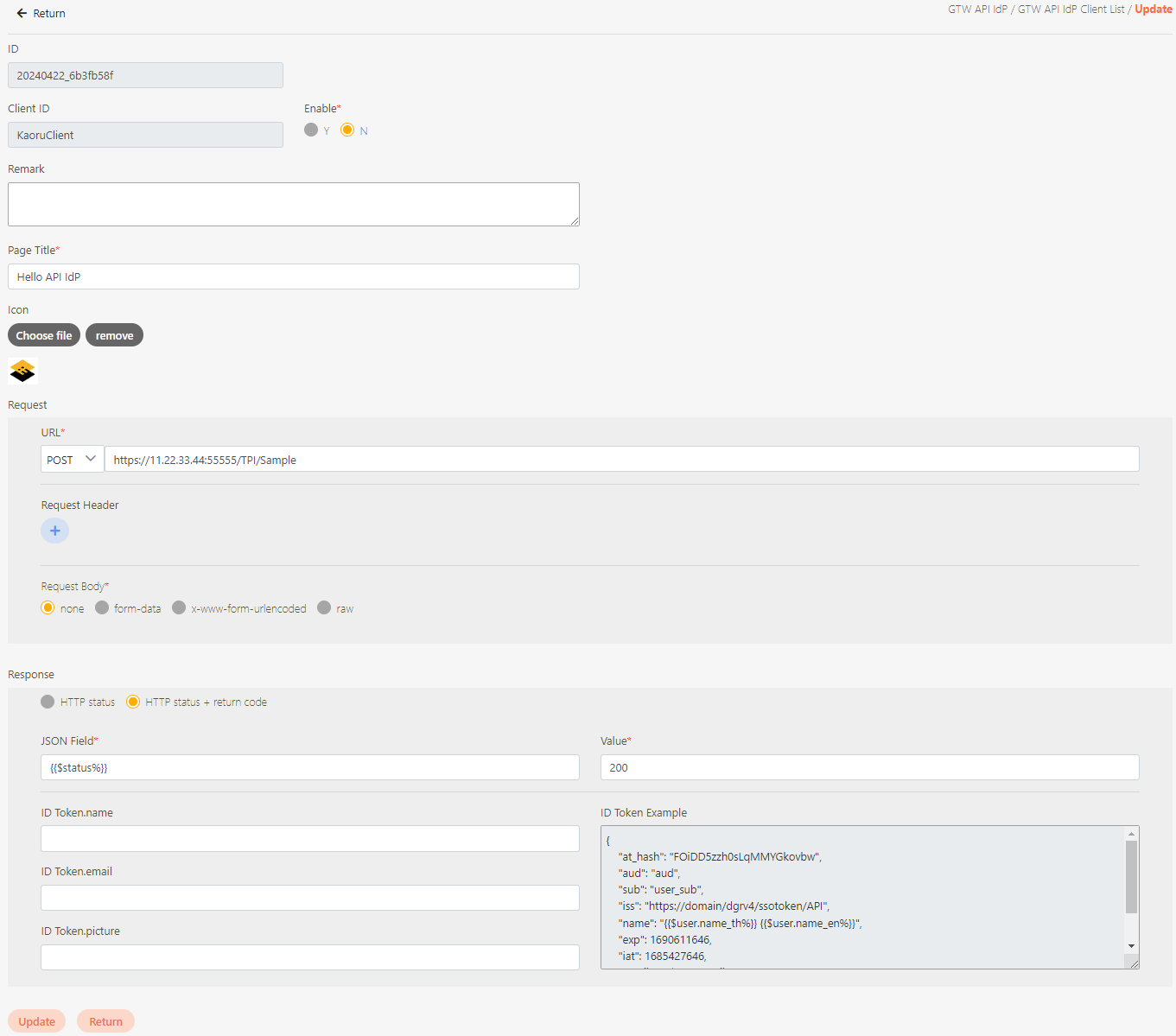 Icon: Click Choose file to select and upload an identifiable GTW API IdP image. If no image is uploaded, the system will automatically use the digiRunner logo.