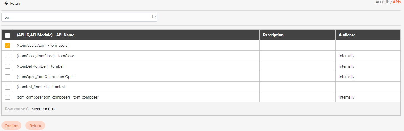 icon to access the API selection page, select the APIs, and click Confirm to save and exit.