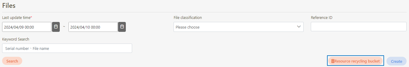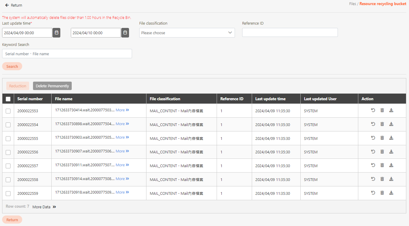 If files were deleted by accident, they can be recovered from the recycle bin. The system will delete the files that are in the recycle bin for more than 1 hour automatically.