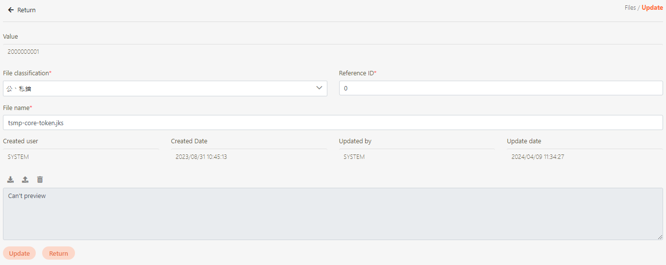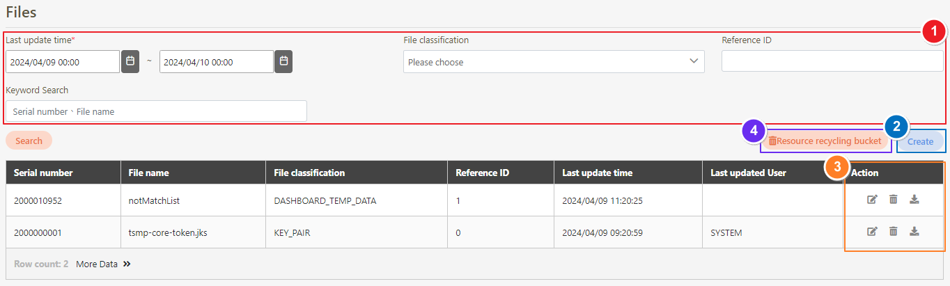 Reference ID*: The serial number of files depends on File classification, which means this file is attached to a specified data sheet under File classification. For example: One of the PK values in the API documentation table is (reference ID) = 1; if this entry of data has two files attached, the recording method is as follows: (1001, API documentation, 1)(1002, API documentation, 1). 1001 and 1002 are the PK values of this table.