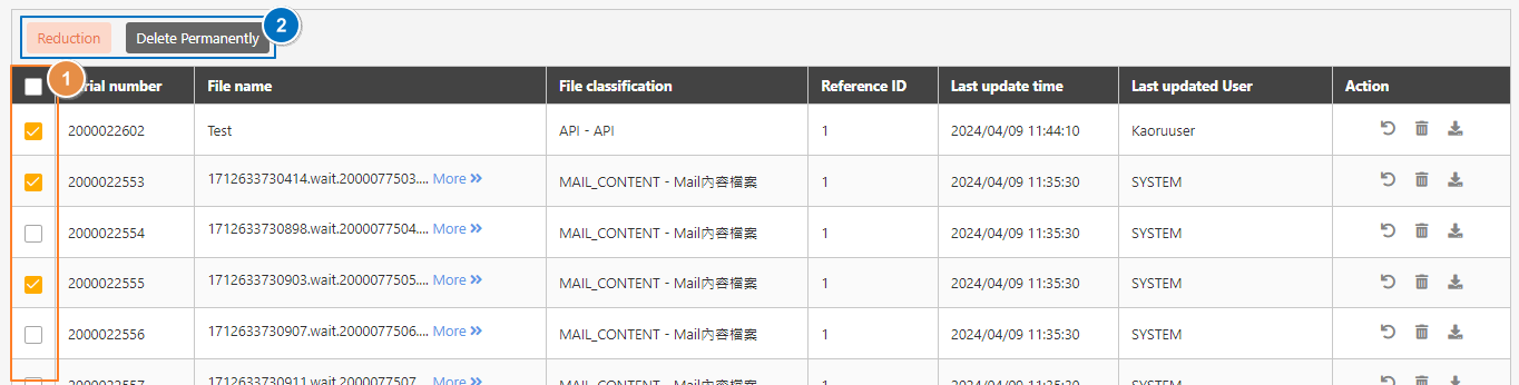 Select the files first (as ➊ below), and click Reduction to restore files or Delete Permanently to delete them permanently (as ➋ below).
