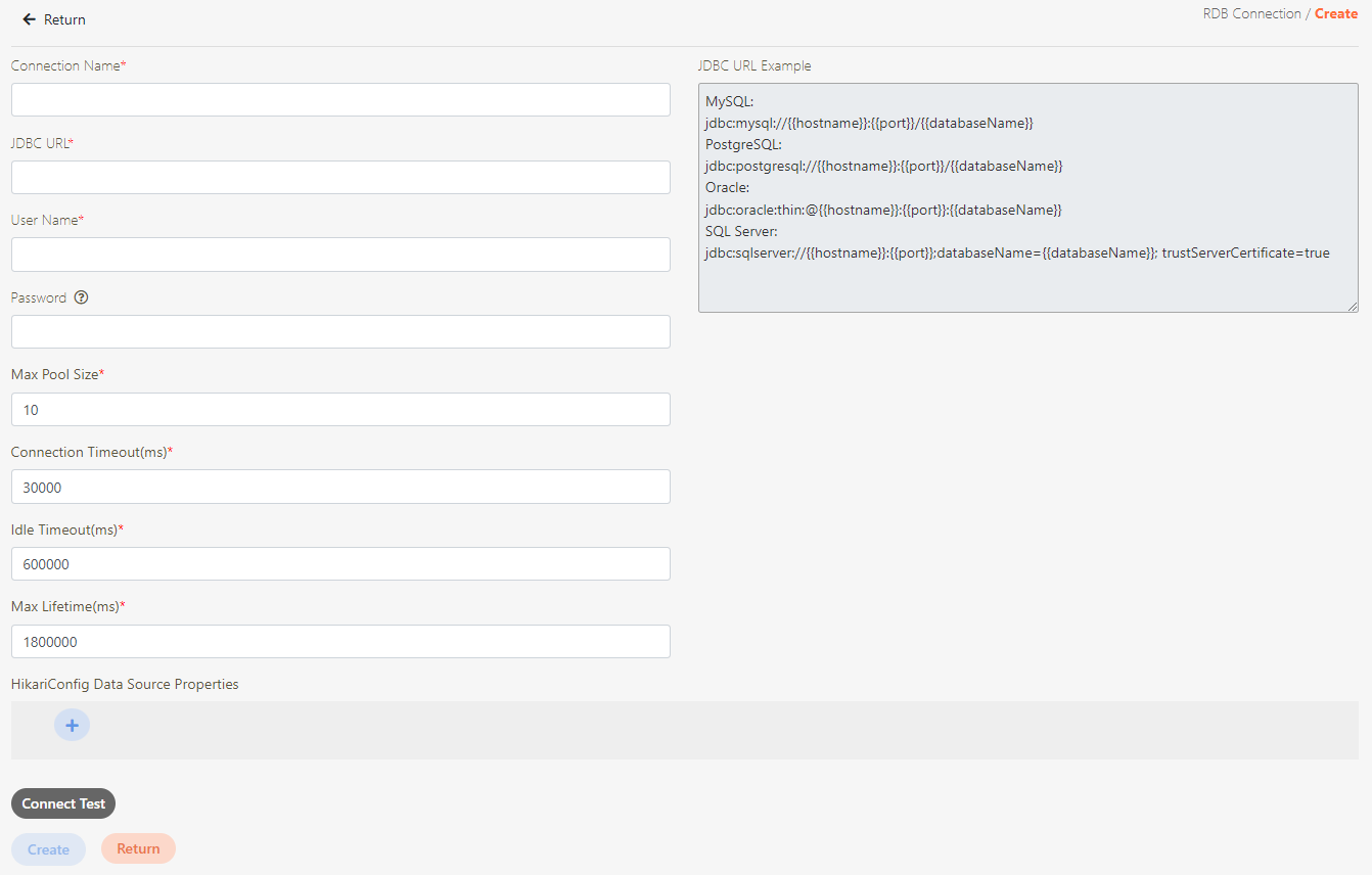 Connection Timeout(ms)*: The duration after which the system times out when attempting to establish a connection to the database or remote servers.