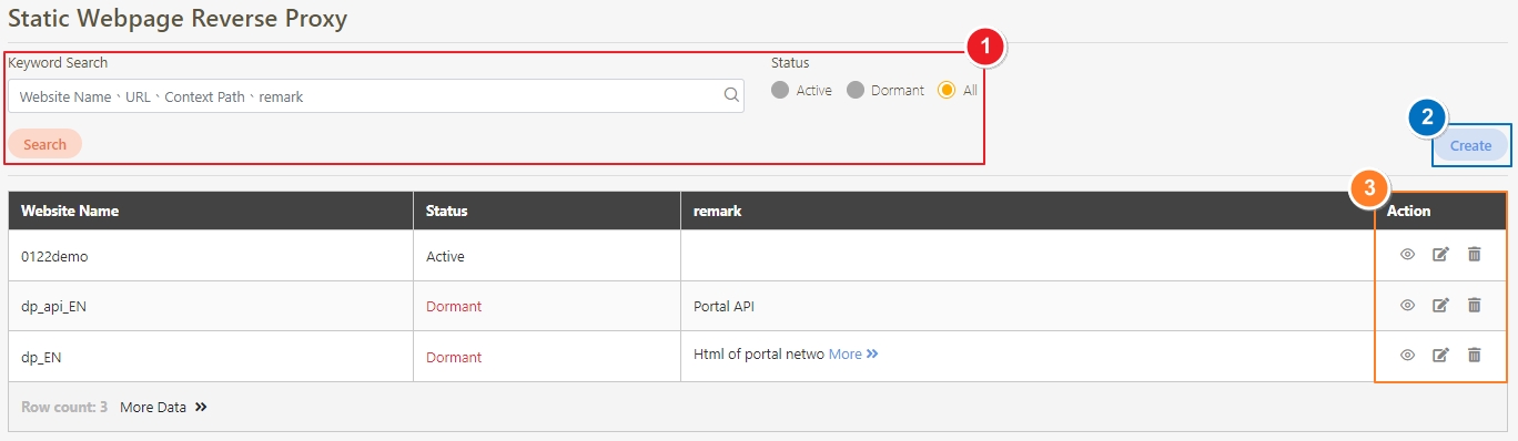 Created sites can be proxied by digiRunner, with the web address being https://{{digiRunner URL}}/website/customized name/.