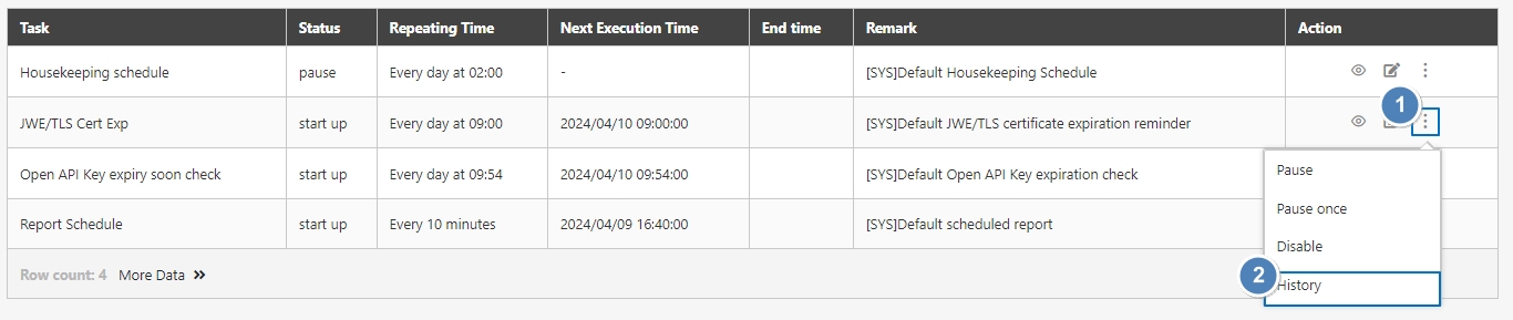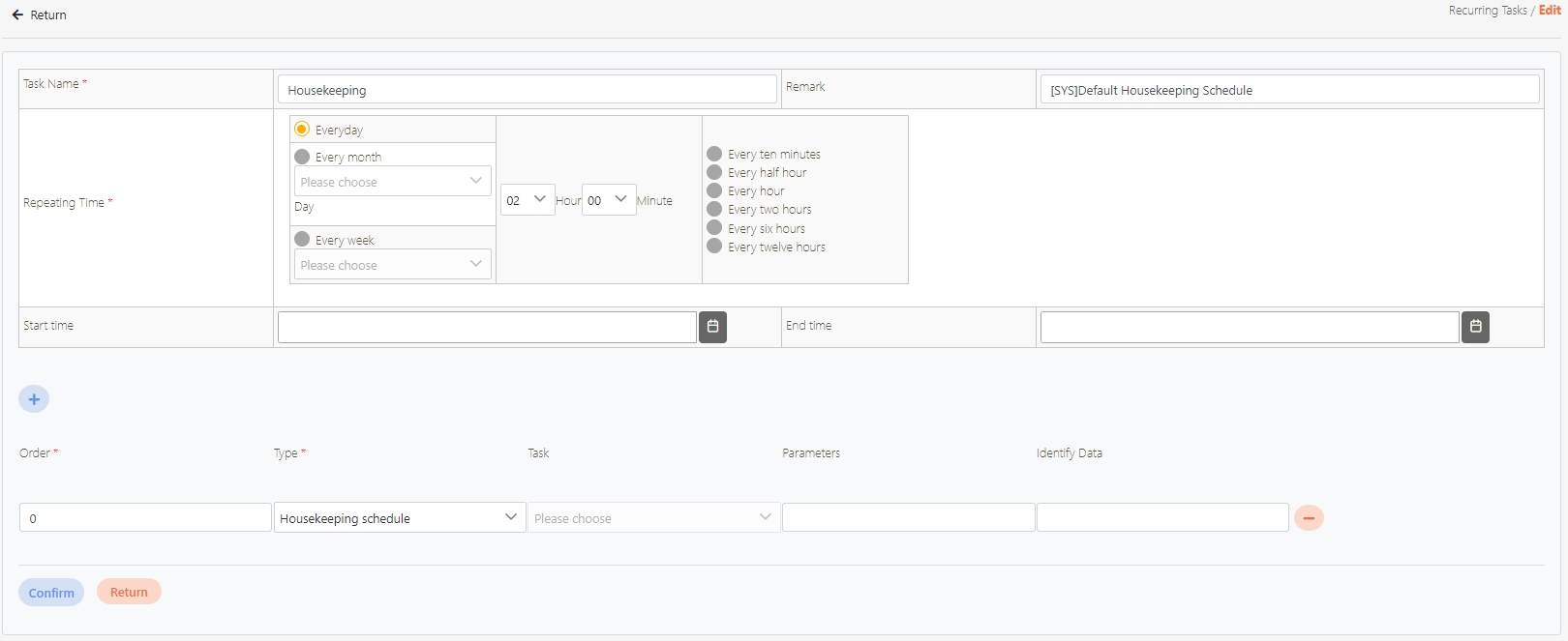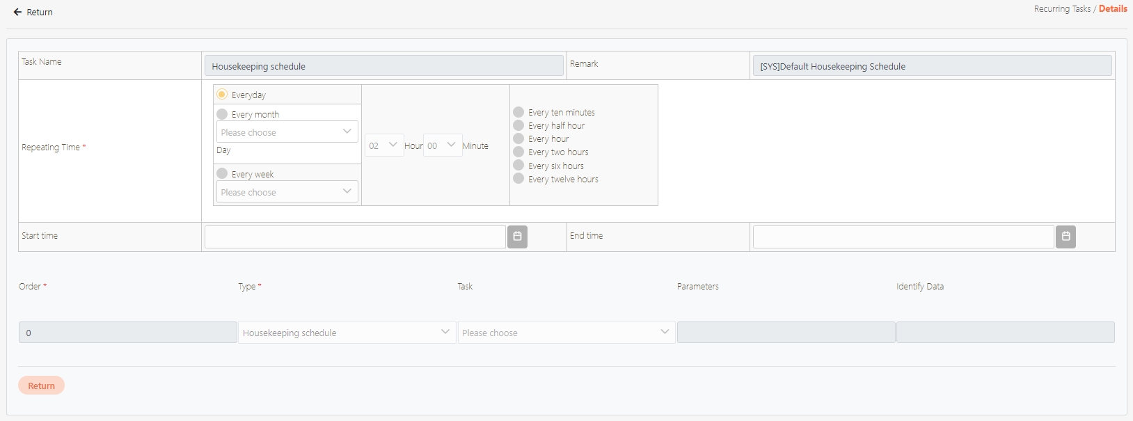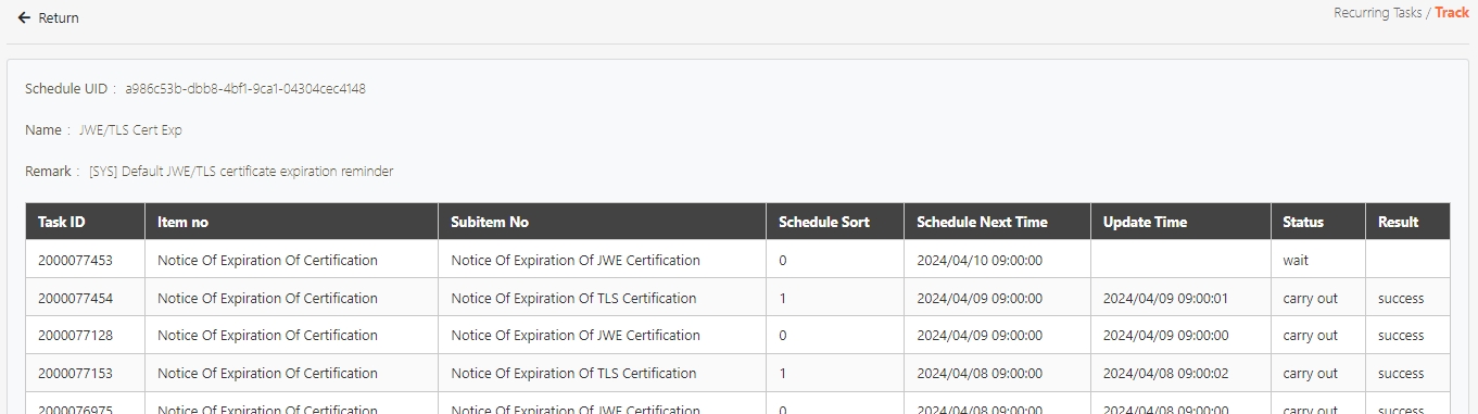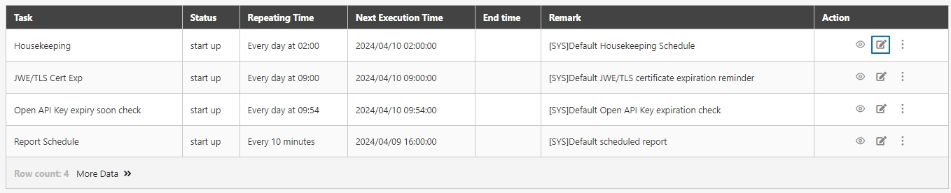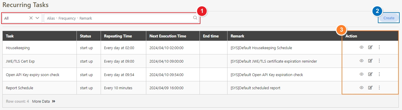 Recurring tasks is used to set periodic schedule tasks, such as: expiry date inspection of API keys and credentials. These schedules are usually set automatically by the system and the period, or they can be changed manually.