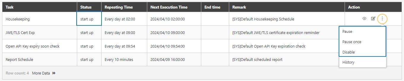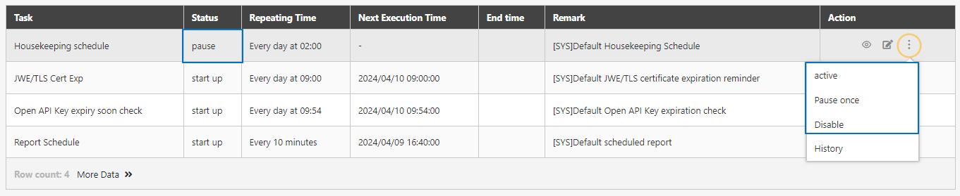For schedules with the status pause, actions such as active, Pause Once and Disable will appear in the menu.