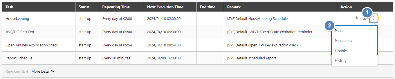 icon (as ➊ below) to expand the drop-down menu (as ➋ below), and click active, Pause, Pause Once, or Disable to enable, suspend, disable, or skip the recurring task once.