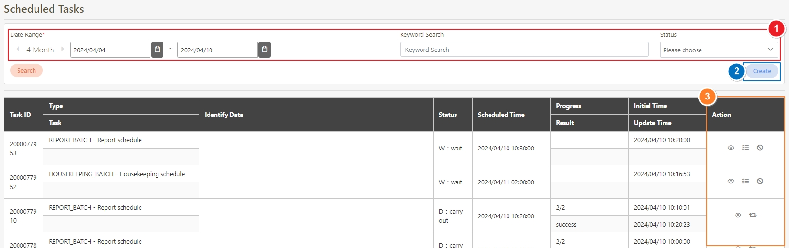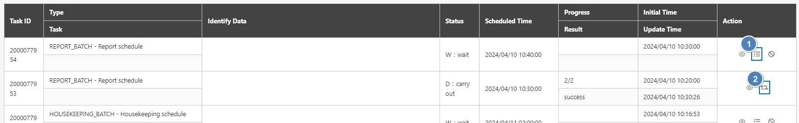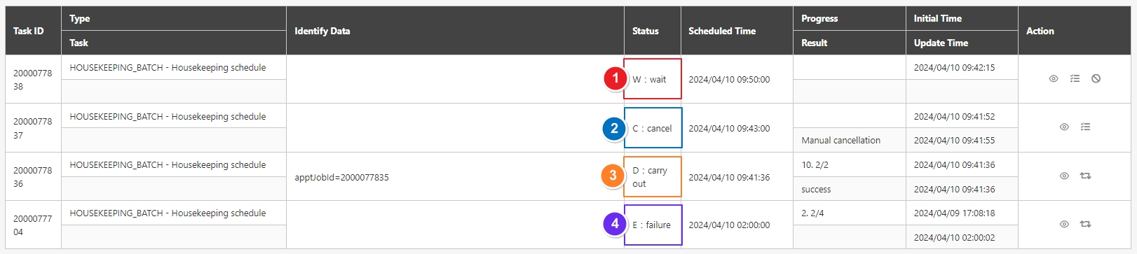 Scheduled operations have five statuses, which are ➊W: wait, ➋C: cancel, ➌D: carry out, ➍E: failure, and R: Executing.