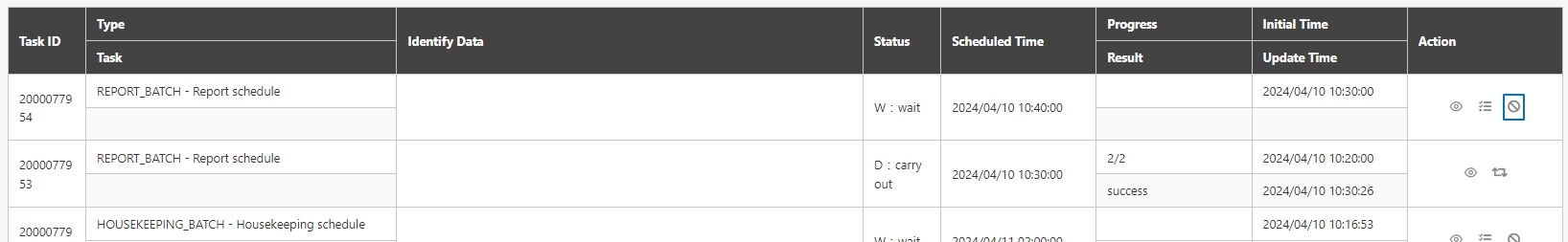 When the schedule status is ➊W: wait, it can be executed and cancelled.