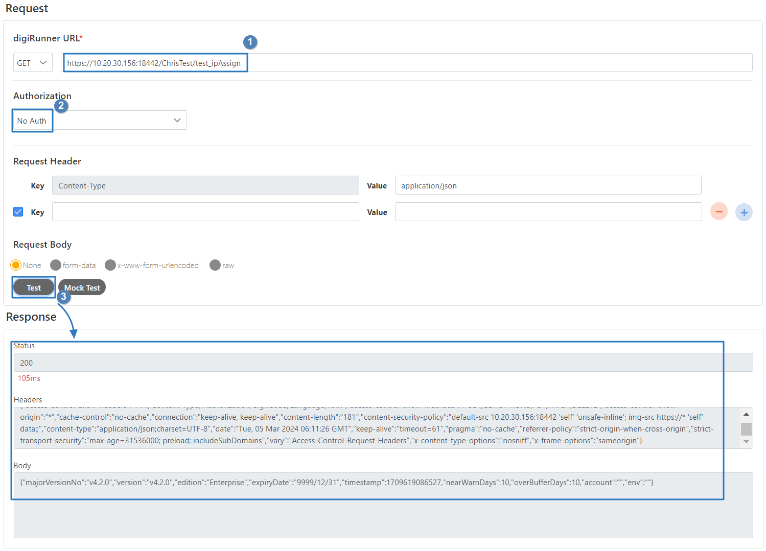 Click Test to view the response. Since the custom IP is defined in the Source IP, it is expected that the return code will be received successfully and be 200, and the Body contains the data defined by the API.