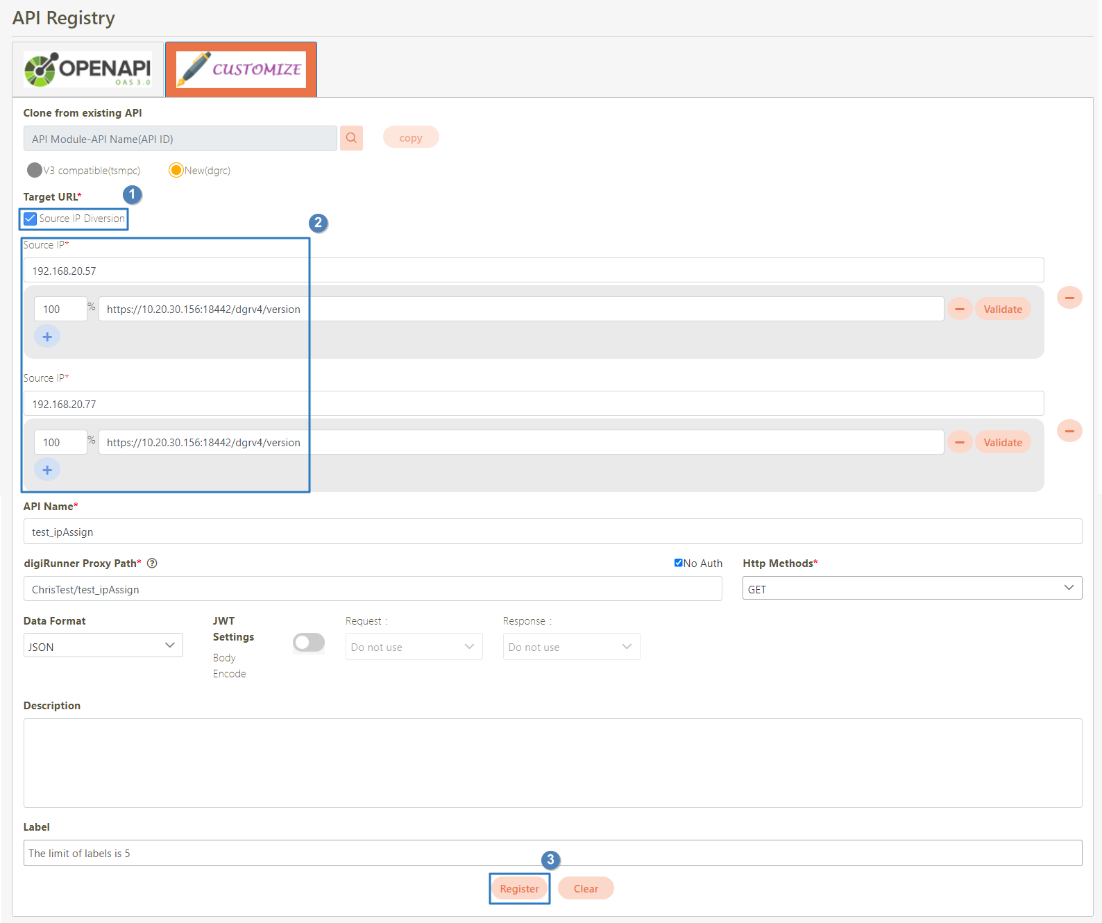 Fill in the Custom IP for the first Source IP, and fill in the API address to call for the target URL.