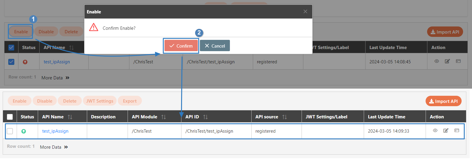 A confirmation window will pop up, click Confirm to finish enabling the API, and the status light will turn green