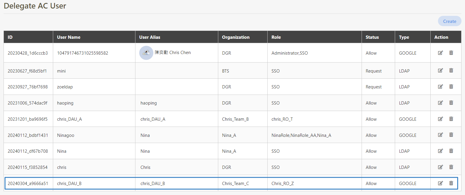 Once created, the newly added user information will be displayed in the Delegate AC User list.