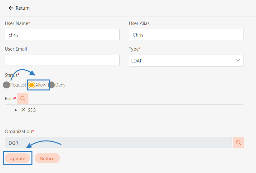 Change the Status field from Request to Allow, and click Update to complete the update.