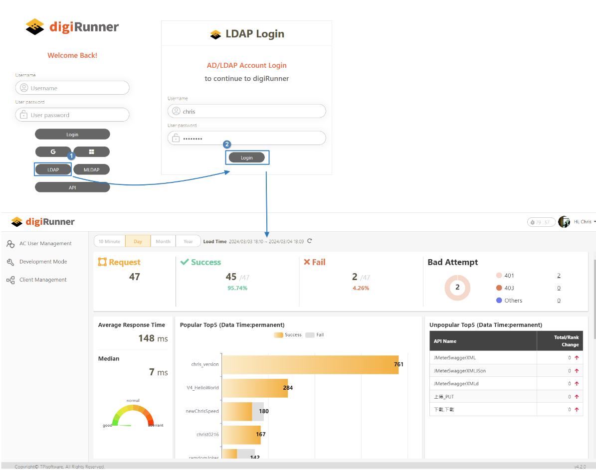 Users logging in with MLDAP and API can refer to the procedure below.
