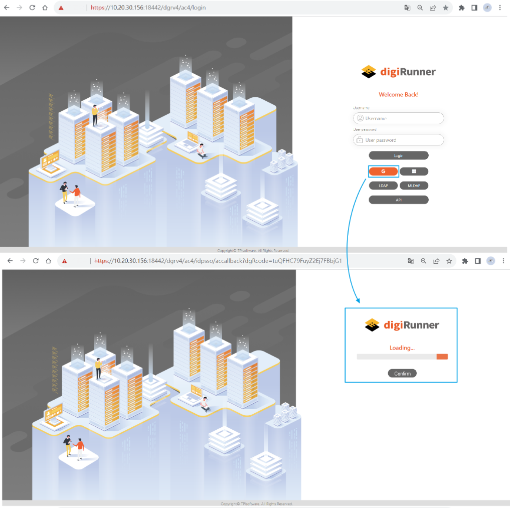 To login using a third-party account, options of this system include: Google, Microsoft, LDAP, mLDAP and API.