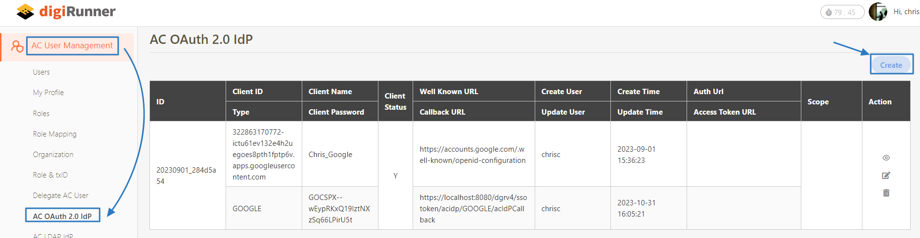 Return to the digiRunner Admin Console. Go to AC User Management > AC OAuth 2.0 IdP, and click Create to proceed.