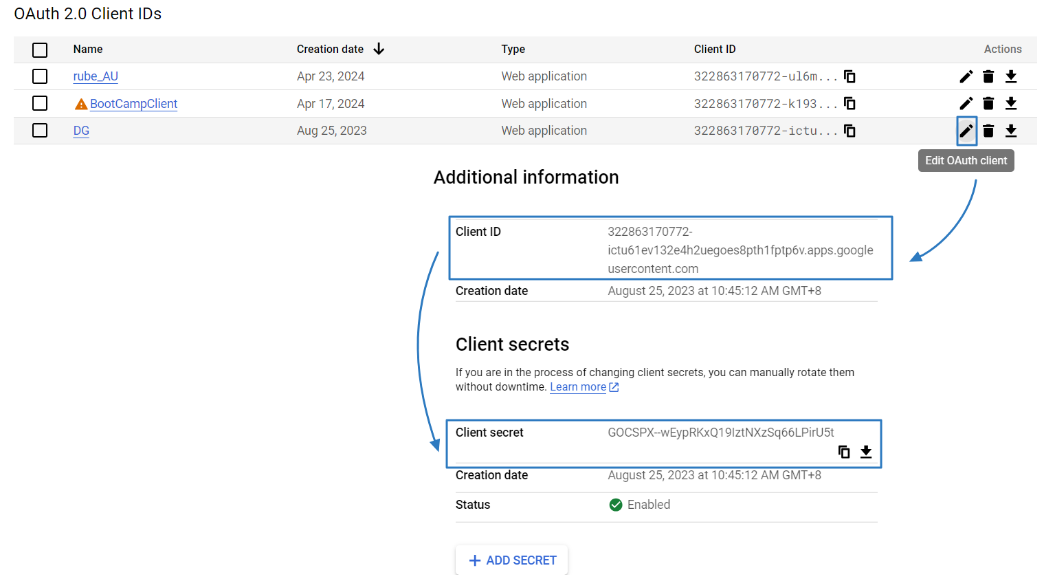 Copy the Client ID and Client secret from the Additional information field for use in subsequent steps as Client Id and Client Password.