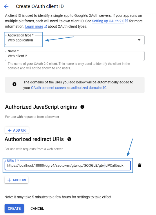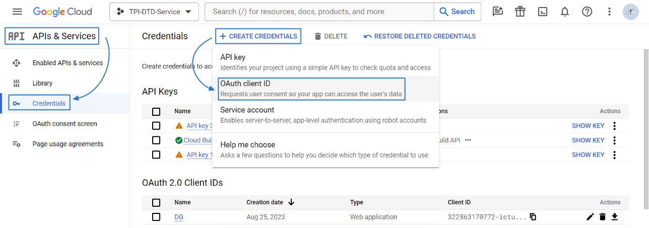 Click CREATE CREDENTIALS > OAuth client ID, and it will jump to the creation page.