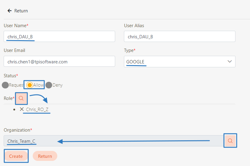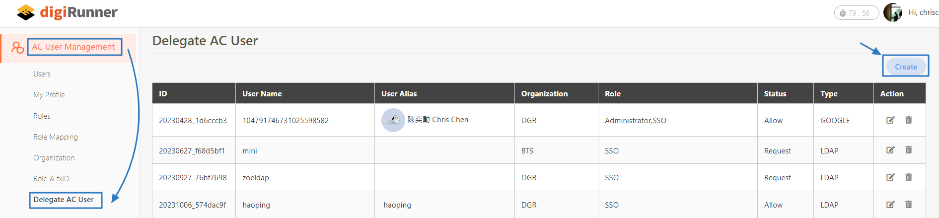 Go to AC User Management > Delegate AC User, and click Create to proceed.