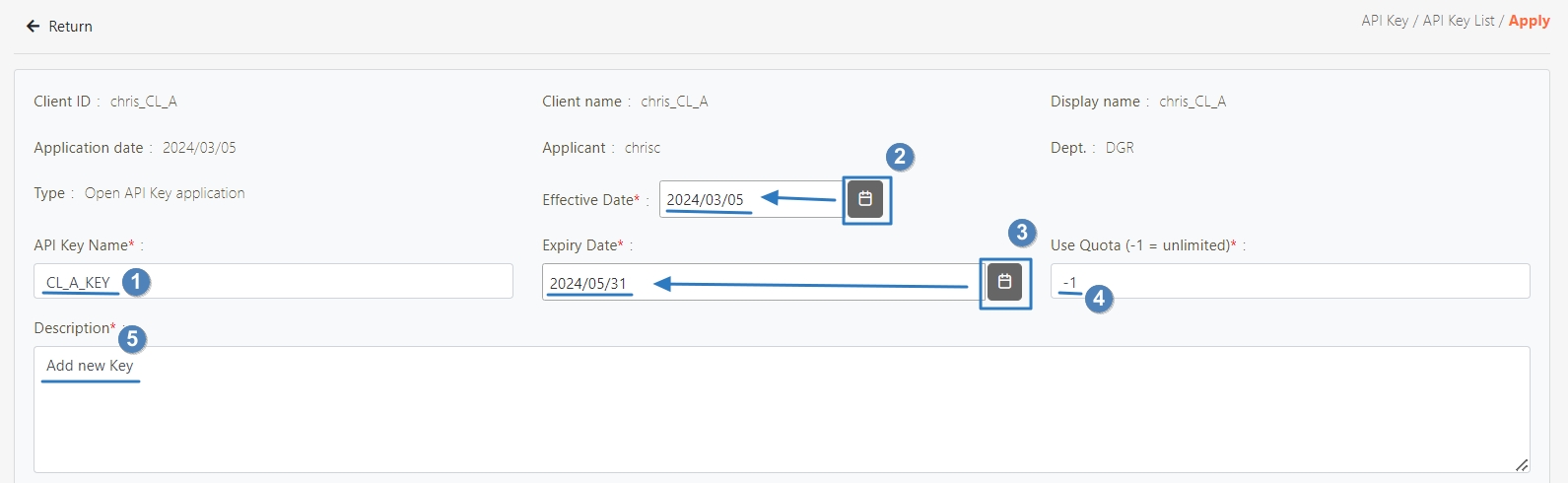 1. Go to Application Forms > API Key, and click on the Details icon of the client to apply.