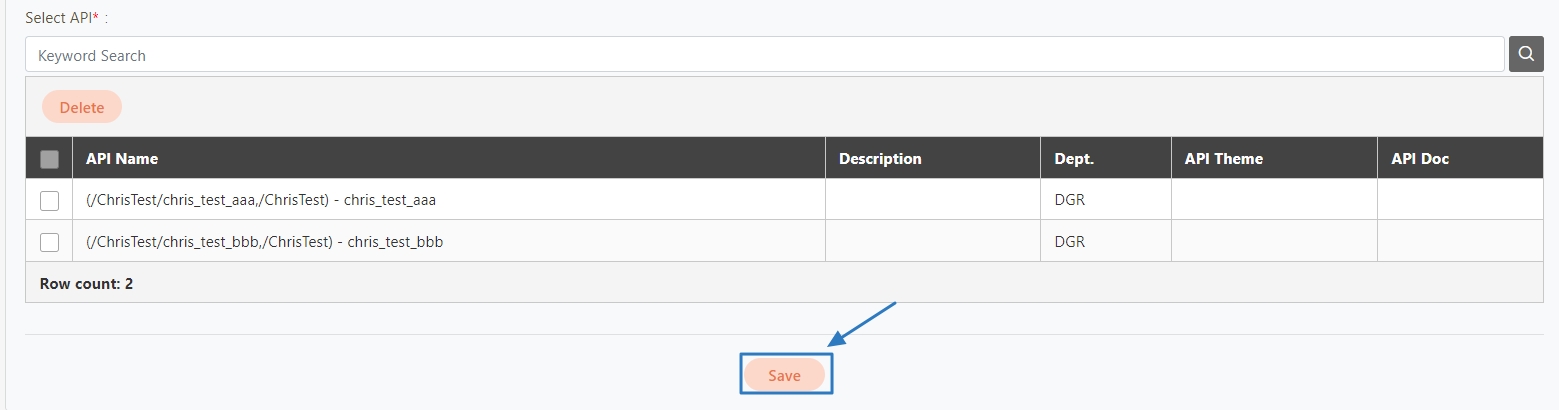 1. Enter the keyword to search in the Select API field, and select the API to apply.