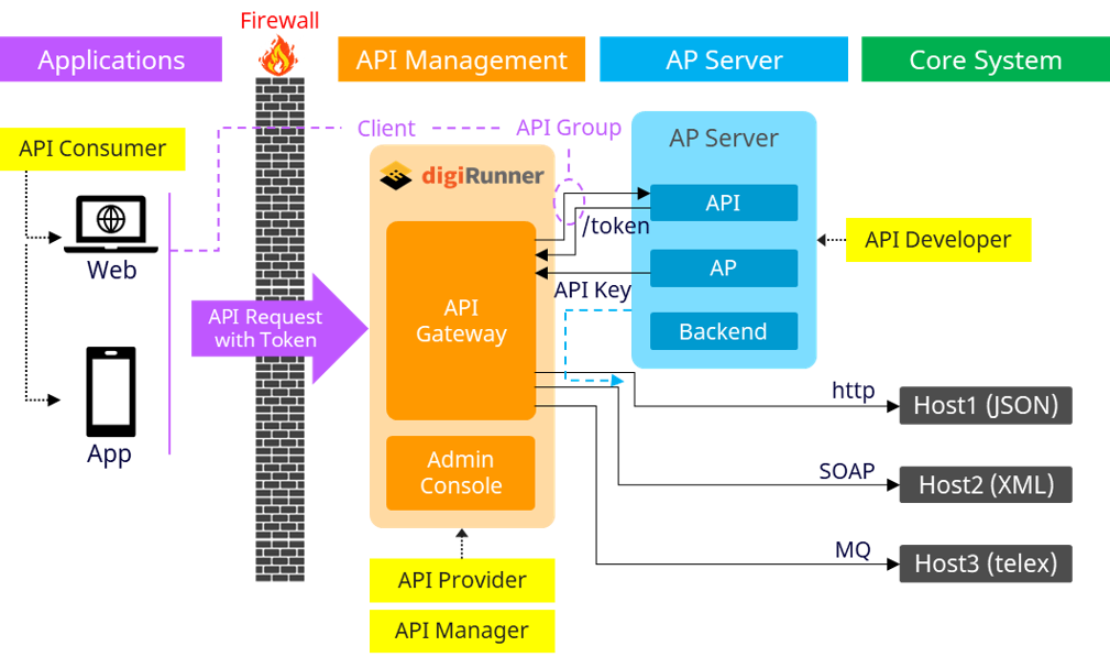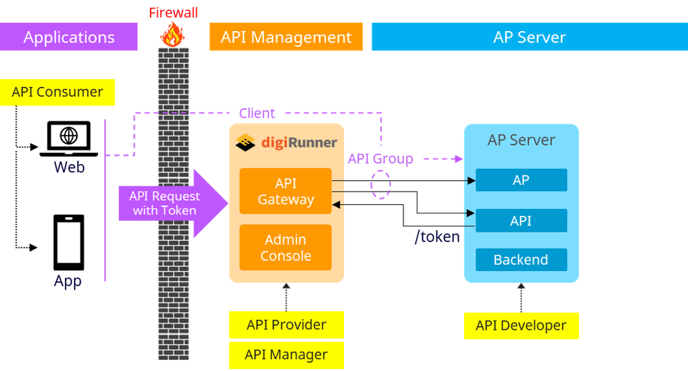 API consumers (web or mobile apps) initiate requests with tokens, which pass through the firewall to the API Gateway in digiRunner.