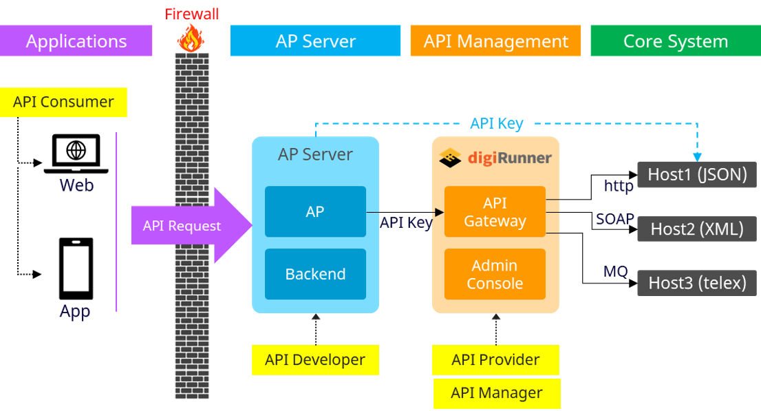 API requests from the client (API consumer) are forwarded through digiRunner to different core system hosts.