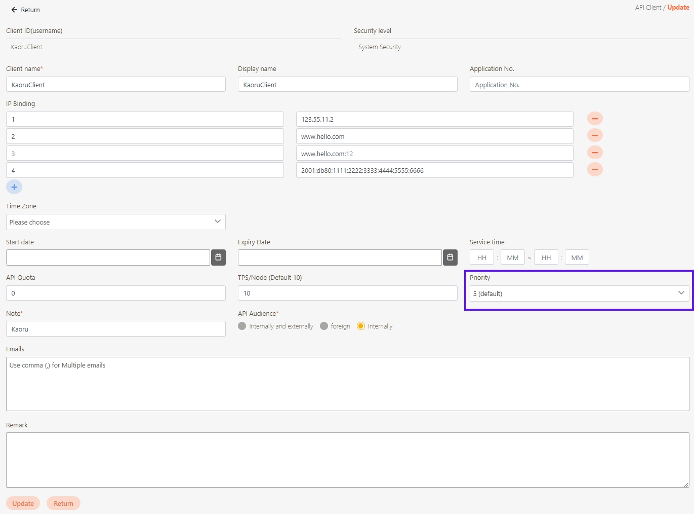 Locate the Priority option, and adjust the priority level to ensure the client receives higher priority in the gateway compared to regular clients.