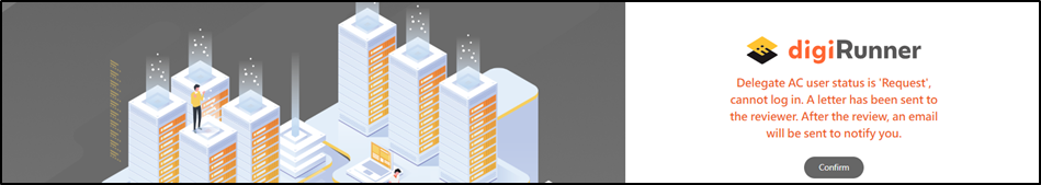 The system displays "Delegate AC user status is 'Request', cannot log in. A letter has been sent to the reviewer. After the review, an email will be sent to notify you.", indicating that the account created by this SSO must be reviewed before it can be used.