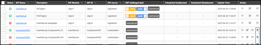 Once configured, the scheduled enablement and disablement dates will be displayed in the corresponding columns in the API list.