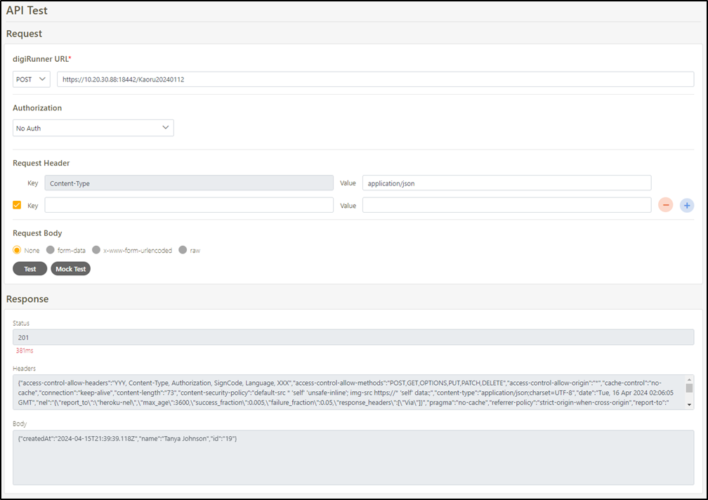 Check the test result in the Response field. If the Status is 201 and data is displayed in both the Headers and Body, the API is functioning correctly and is ready for use. If the response status is 201 and data is displayed in both the Request Header and Request Body, the API is functioning correctly and is ready for use.
