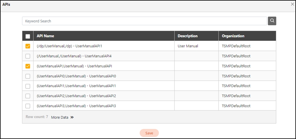 Several APIs can be selected, and Save has to be clicked when finished selecting in order for the system to carry over the selected APIs.