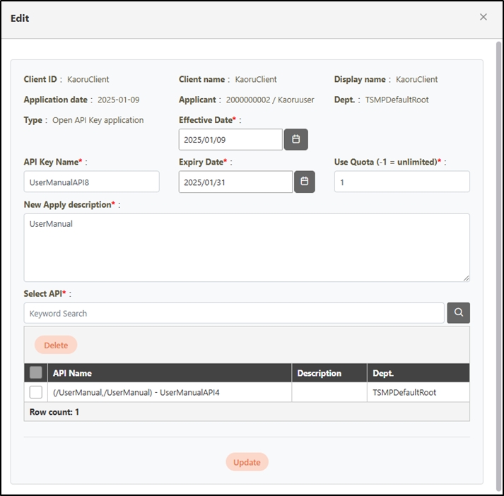 The Edit page will pop up. Modify the desired fields, and click Update to save and exit.