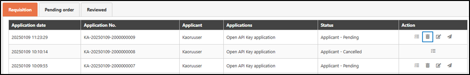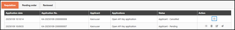 Upon submitting applications, the user can view them under the Requisition and Pending order tabs. The status of the applications will now change to Manage - Pending.