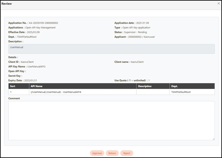 Click on the icon to open the Review page, and click Approve, Return or Reject to perform the corresponding actions.